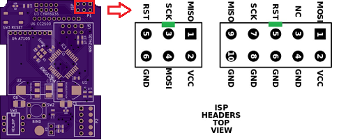 **Important:** The USBasp **must** be **3.3V**. Using a 5V USBasp (most blue PCB type) will fry the RF modules as they are not 5V tolerant.