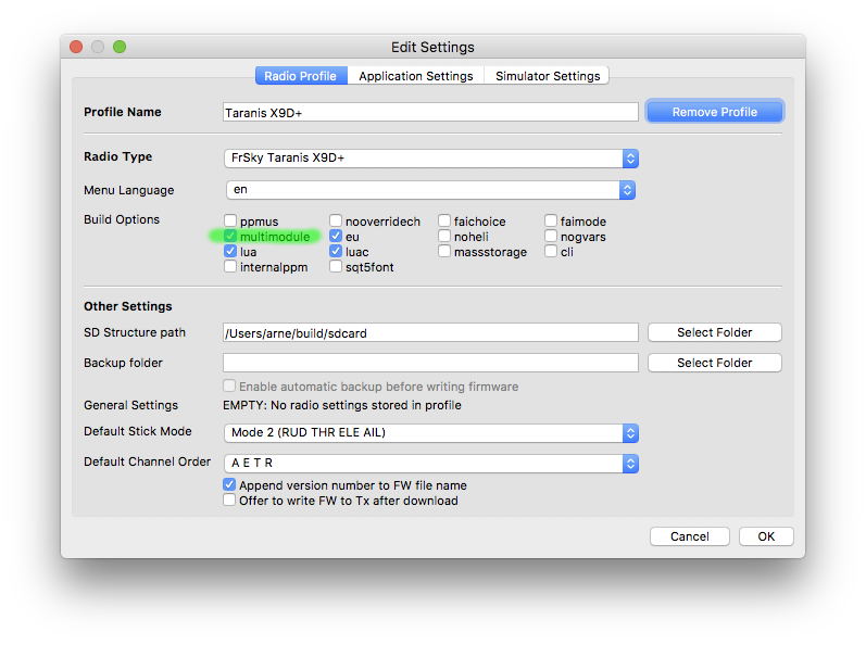 - Please make sure that the "multimodule" option in OpenTX Companion is checked: