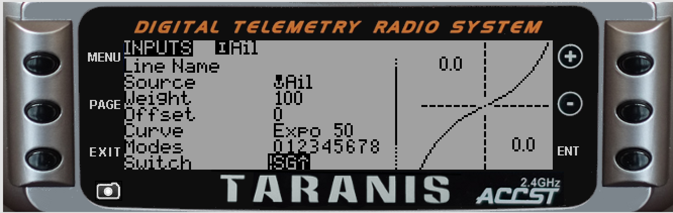 The follwing INPUTS screen shows one potential setup to introduce expo for Acro mode. The activation of the expo on Roll, Pitch and Yaw is when the SG switch is not in the back position. Add to taste.