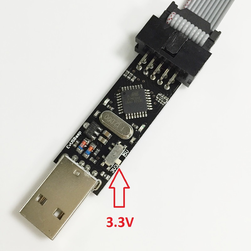 **Important:** The USBasp **must** be **3.3V**. Using a 5V USBasp (most blue PCB type) will fry the RF modules as they are not 5V tolerant.