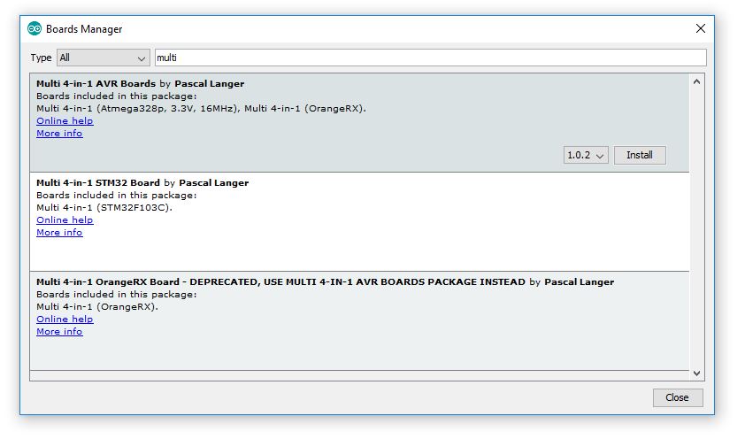 Note: The Orange RX module is now included in the Multi 4-in-1 AVR Boards package, it no longer has a dedicated package. If you have the dedicated OrangeRX package installed you should remove it and install the most recent AVR package (v1.0.2 or newer).